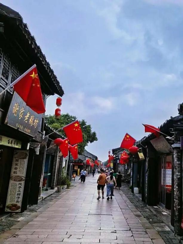 氛围营造工程以"红动东关"为主题,在沿街路灯杆、商铺门前有序悬挂鲜艳五星红旗。一面面红旗与古街的历史肌理交织,形成"红映古街、家国情长"的喜庆画卷,让家国情怀浸润每处角落。