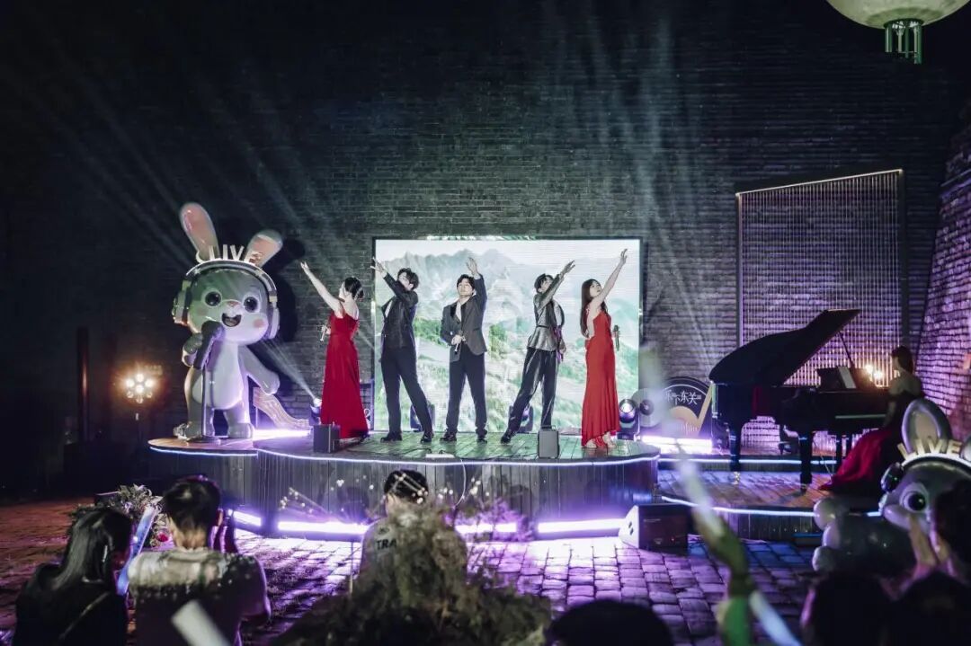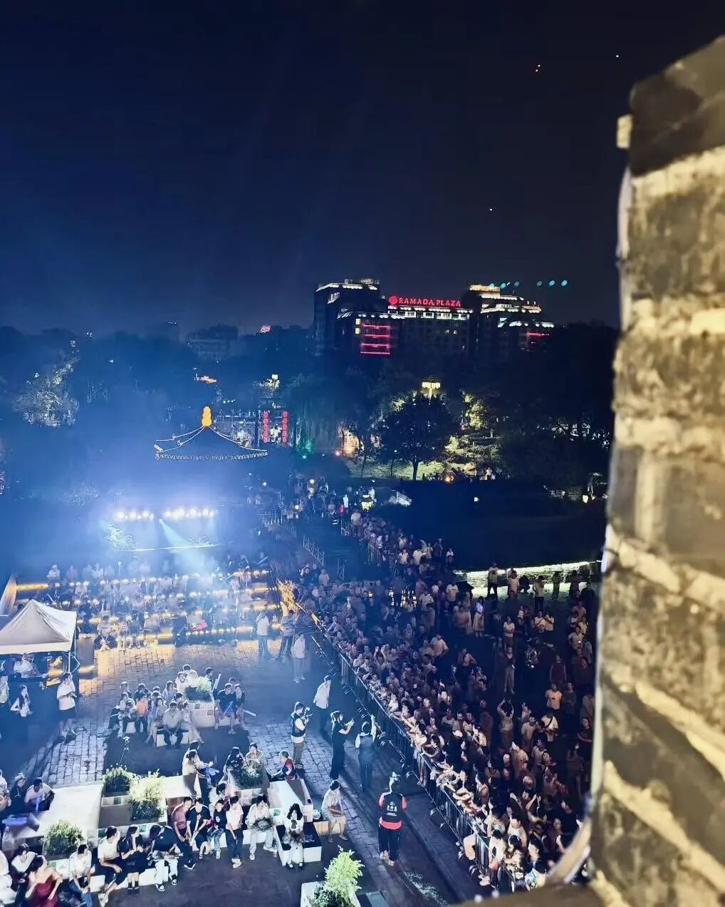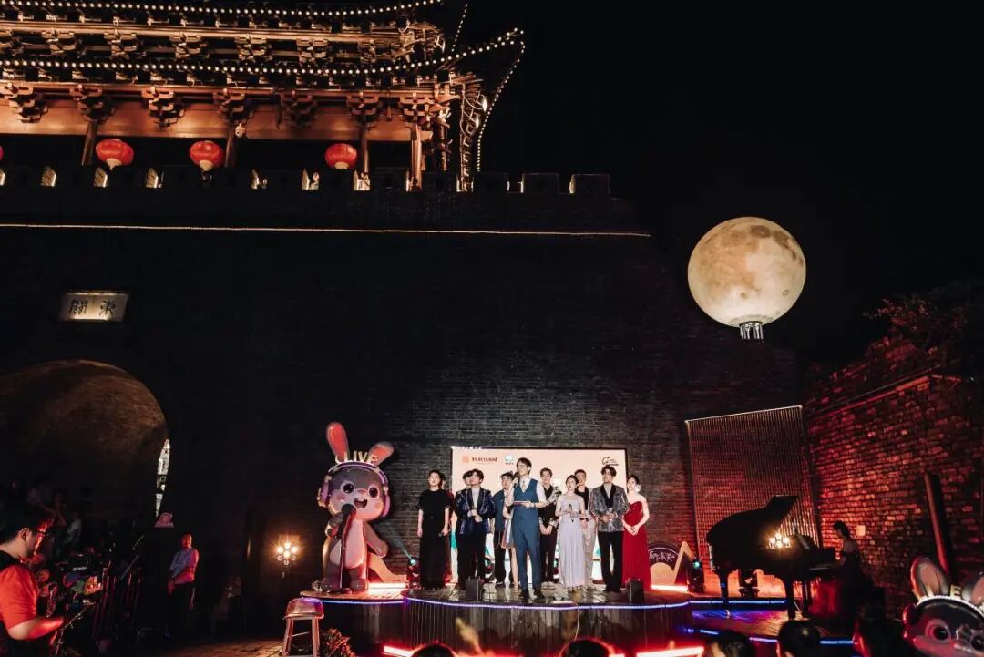 傍晚六点半,音乐会在主持人热情洋溢的开场中拉开帷幕。在介绍完活动 “文旅赋能、文化碰撞、空间创新”的核心理念与到场嘉宾后,“纸鸢叩月・启幕盛典” 仪式成为全场首个高潮——嘉宾们共同执起 “时光之钥”,叩响象征古今交融的 “时光月门”。伴随主题旋律奏响,系着荧光丝带的大纸鸢从东关城楼缓缓升空,嫦娥舞者轻盈起舞,冷焰火瀑布倾泻而下,光影与音乐交织,瞬间将千年瓮城化作连接历史与当下的 “音乐剧场”,正式宣告 “乐下东关” 微 Live 时光音乐会启航。