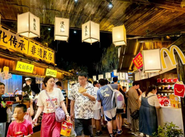 创新融合,不是简单的“新瓶装旧酒”,而是要让传统空间在当代语境中“长”出新生态。为此,我们以“历史建筑+潮流业态”经营理念,推动东关街从“旅游打卡地”向“生活方式体验场”转型。长乐客栈的“盐商宴”沉浸式餐饮,让游客穿戴古装参与“议事厅议价”“码头卸货”剧情,解锁“漕运密码”“商帮契约”等历史典故,实现“一筷一盏皆剧情”的深度体验。项目运营以来,累计接待游客超8000人次,停留时长从2.1小时延长至4.5小时,带动周边商户营收增长30%。街区东门城楼《创世·山海经》数字孪生平台更以AR技术让128只神兽“破卷而出”,吸引超万名游客深度体验,带动数字文创销售额增长45%,验证了“数字技术+在地文化”的变现潜力。这种“传统空间+数字科技”的创新融合,让老街既保有历史厚重感,又充满现代生活气息。