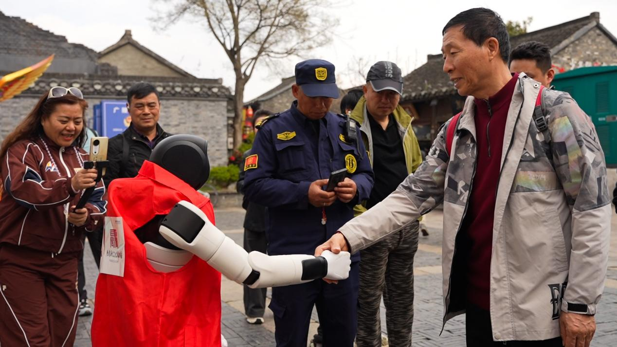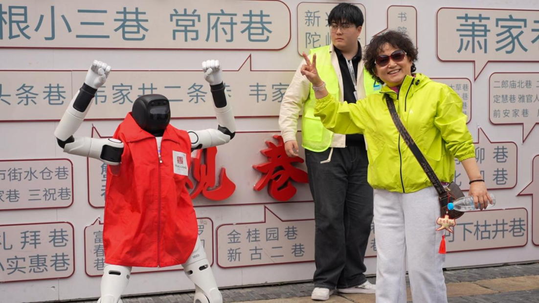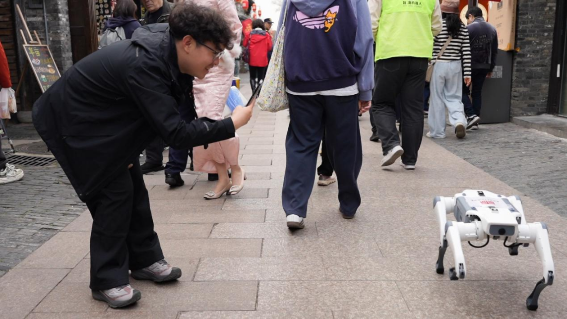 除了趣味表演,两款机器人还承担着智能引导职责。机器狗模拟动态巡逻姿态,人形机器人则缓缓行走其间,为游客提供全方位的贴心服务。二者相辅相成,既让游客感受到科技带来的便捷与乐趣,也让非遗文化、古街底蕴通过智能互动,更生动、更高效地传递给每一位游客。